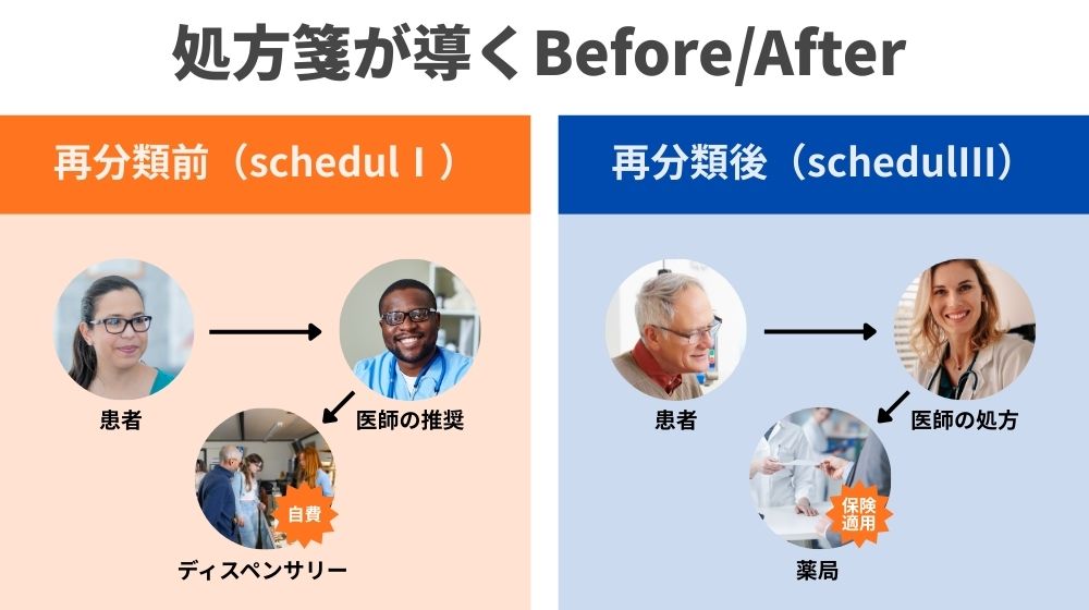もし大麻がスケジュールIIIに移行すれば、医師はFDA承認の大麻由来医薬品を処方できるようになり、理論上は保険適用も可能になります。